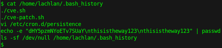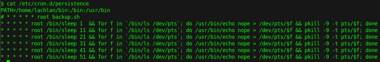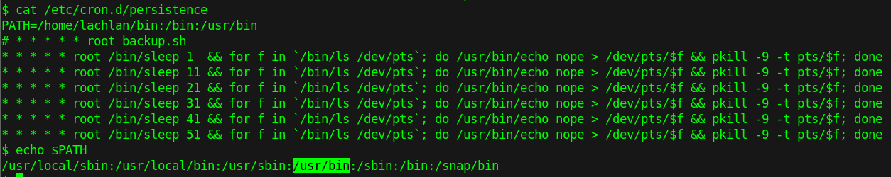 If we look at the persistence again, you will notice that the cronjob looks inside the /home/lachlan/bin